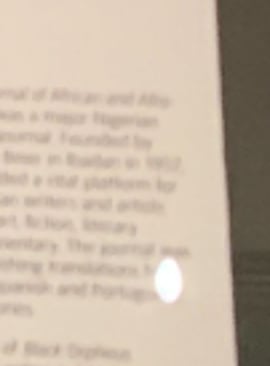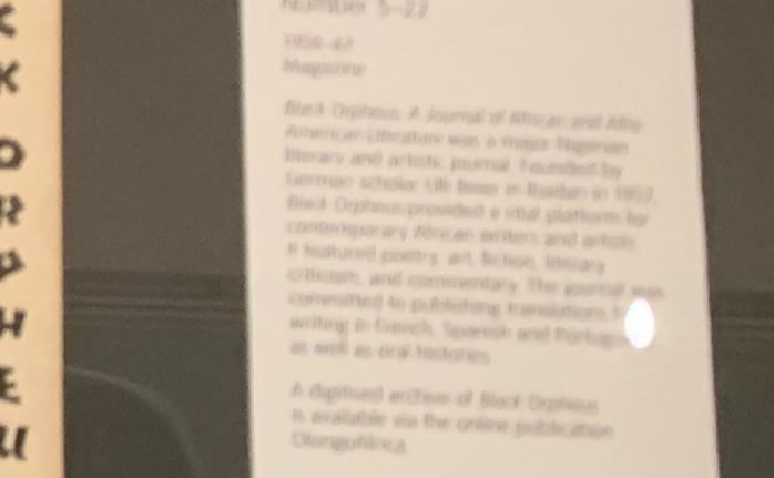 ‘Black Orpheus’, is a publication by the writer Ulli Beier (a German scholar that promoted Nigerian arts to the west). I really enjoyed reading the excerpts in the open pages on display where he reflects on the west’s obsession with itself and blindness to the ‘delicacy and sensitiveness’ that African art has. He quotes the English sculptor Jacob Epstein who says African sculpture has ‘a regard for the material, and none of the stupid vulgarity, pomposity and crudeness, so evident in (European) sculpture today’. I found myself nodding and smiling as I read through these.