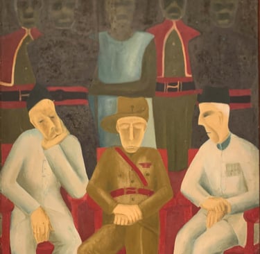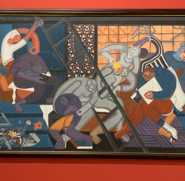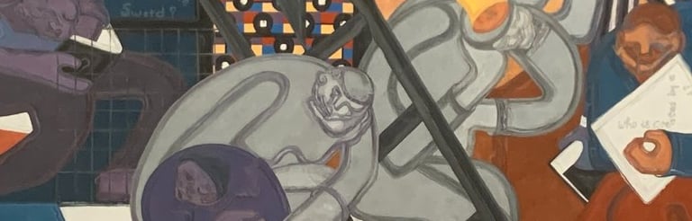 A painting by Uzo Egonu. In his painting, the artist expresses his fear about how power and technological advancement shape the destiny of humankind. His concern is that real advancement cannot be made if we don't grow our knowledge. It resonated, especially now, as we increasingly rely on AI. We outsource thought, stop being critical. In his painting the empty ladder is within reach- but no one uses it, they are busy doing other things (roughly translated as; watching netflix and doom scrolling).