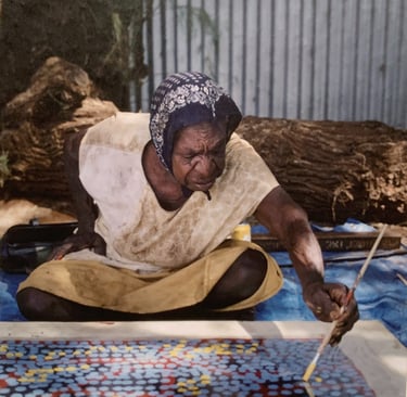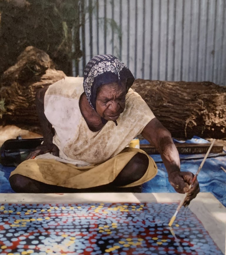 So whilst staring into the abyss of her dot-covered canvases it felt like Kngwarray had a special understanding of this dispossessed land. She knows it so deeply- recording its textures, its vastness. She makes her point - she does it over and over again. There is no unseeing it. With these iterations her style and storytelling would not have evolved the way it did. (Iterations, Anusha - let us not be scared). And those colour combos- she really knew her pairings.