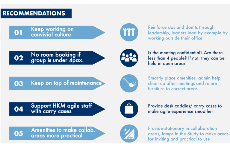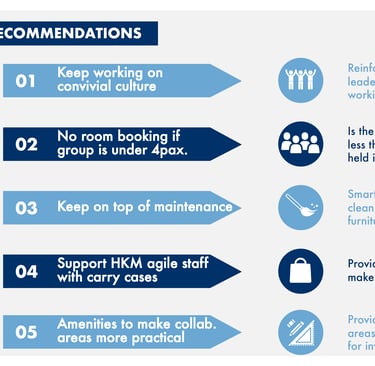 Combining Methods: In an Office Headquarters Transformation project in Hong Kong, I balanced quantitative and qualitative data: we used a comprehensive quantitative pre-move survey (achieving a high 78% completion rate) alongside on-site ethnographic observations to identify pain points like the need for better acoustic quality and privacy.